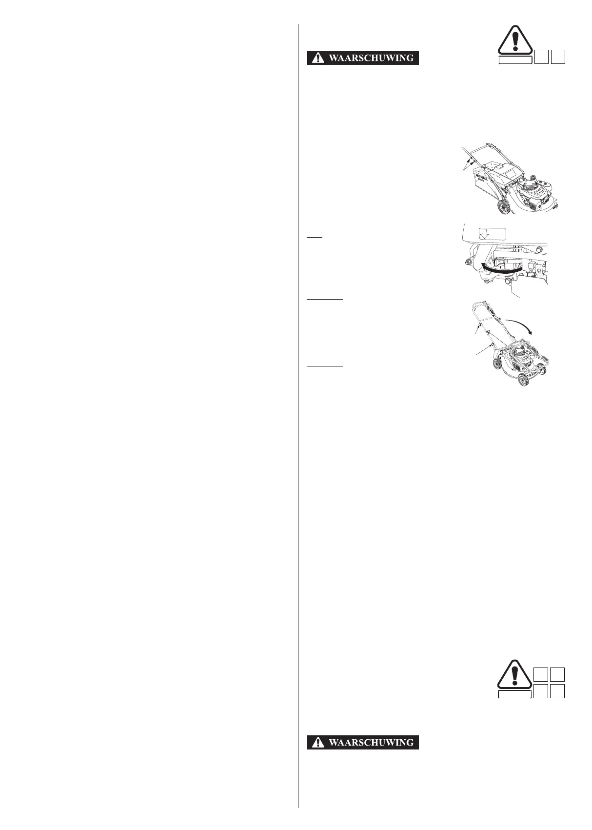 • Vervoer de maaier horizontaal, met alle vier wielen op de