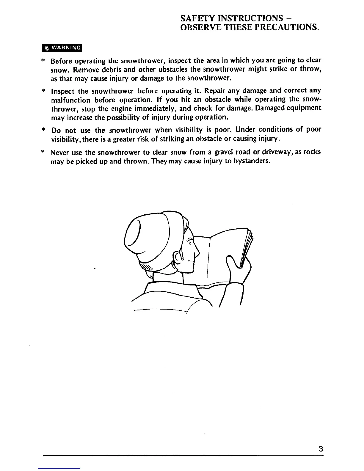 * Do not use the snowthrower when visibility. is poor. Under conditions of poor