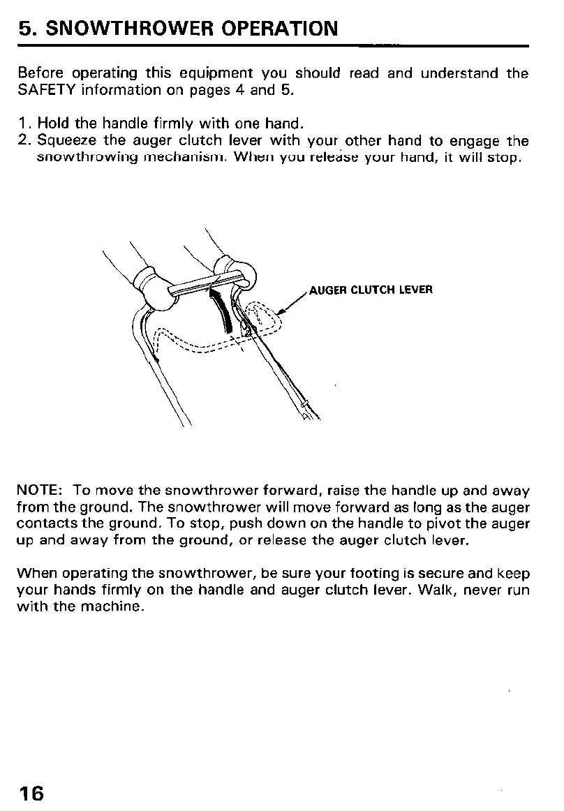 your hands firmly on the handle and auger clutch lever. Walk, never run