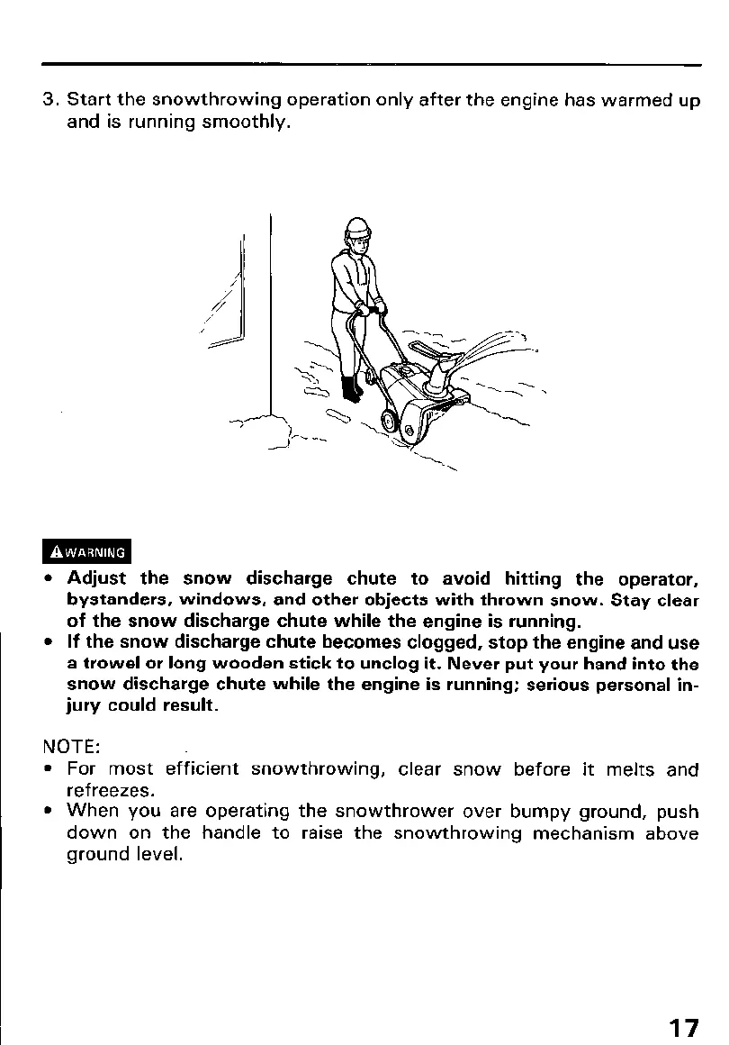 l Adjust the snow discharge chute to avoid hitting the operator,