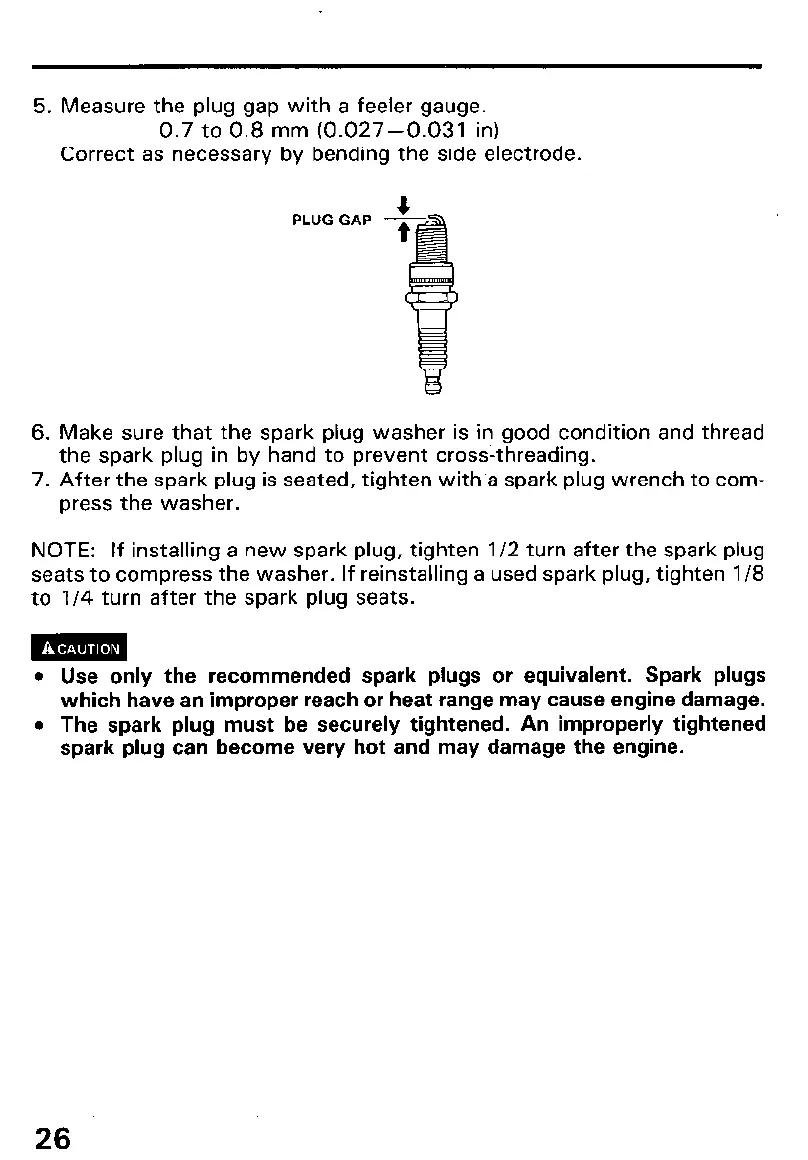 seats to compress the washer. If reinstalling a used spark plug, tighten l/8