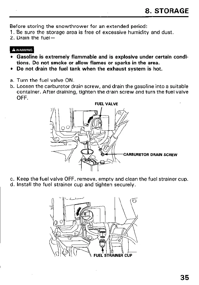 b. Loosen the carburetor drain screw, and drain the gasoline into a suitable
