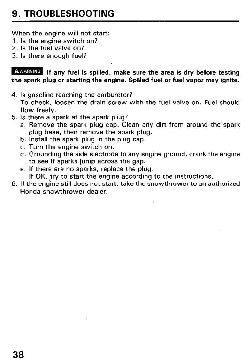 the spark plug or starting the engine. Spilled fuel or fuel vapor may ignite.