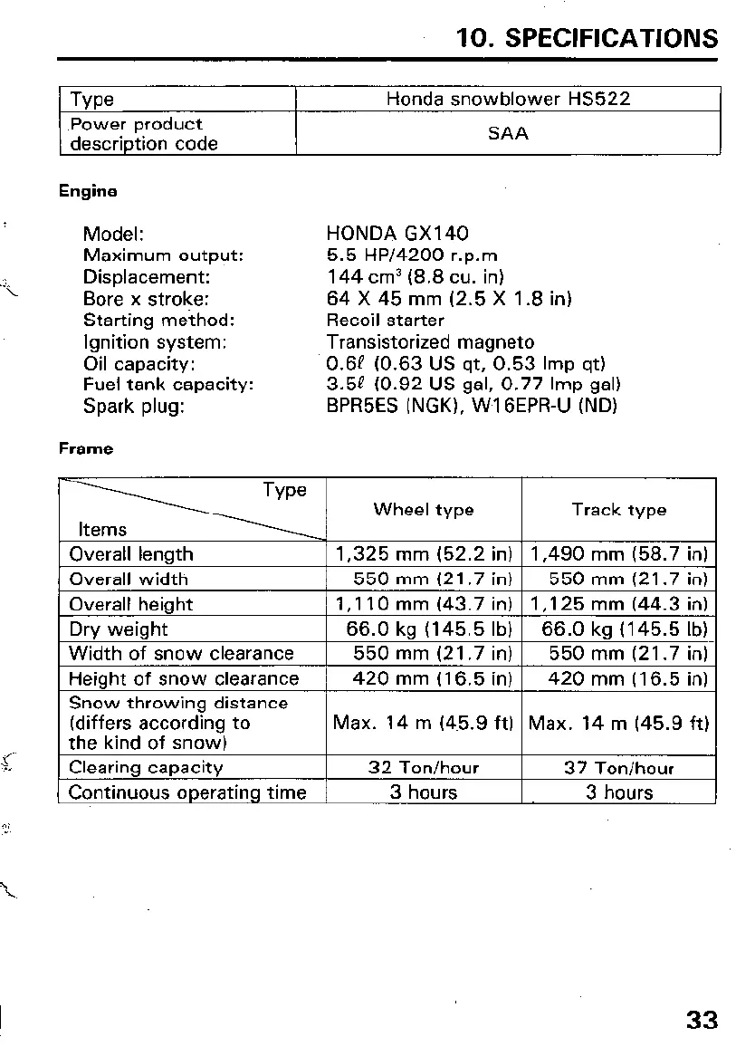 Width of snow clearance 550 mm (21.7 in) 550 mm 121.7 in)