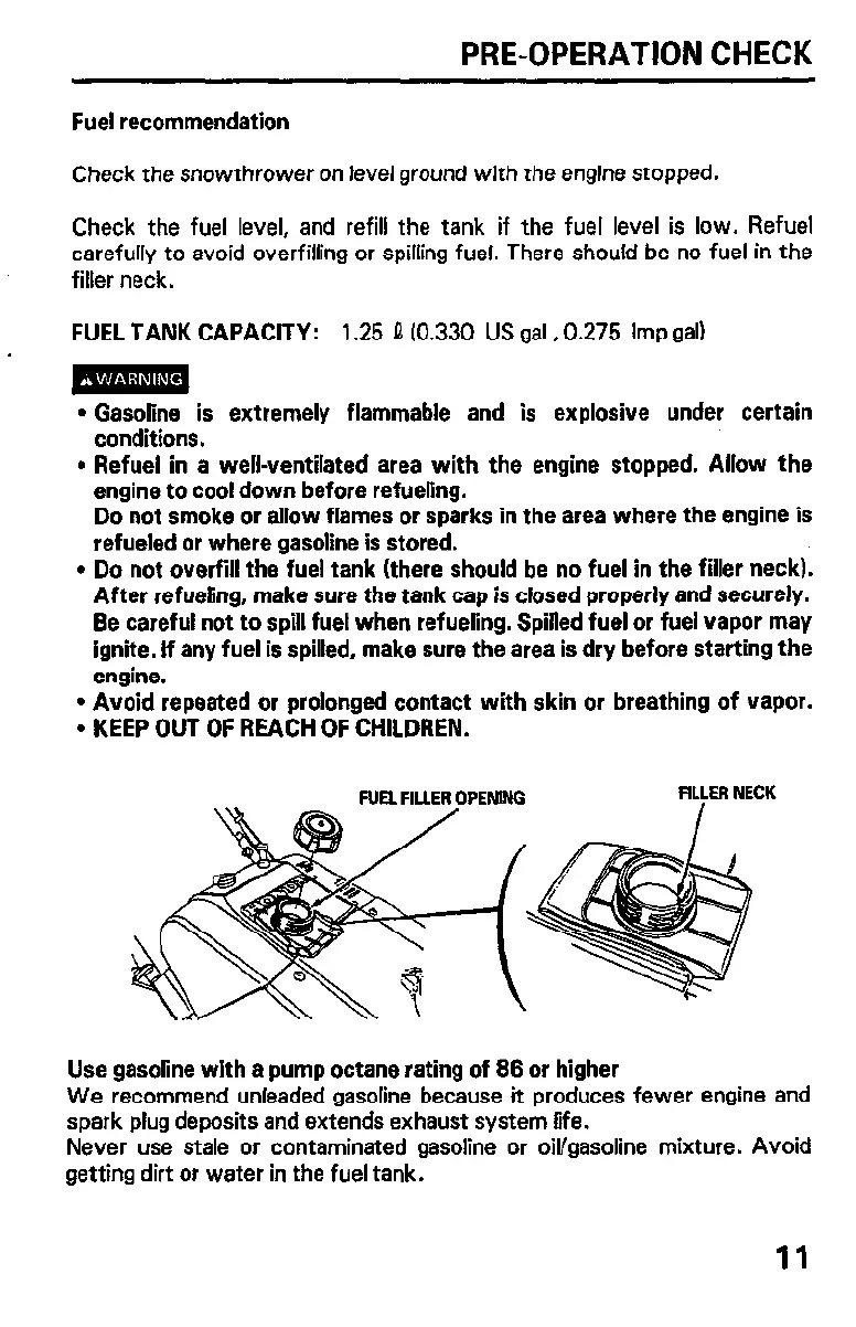 carefully to avoid overfilling or spilling fuel. There should be no fuel in the