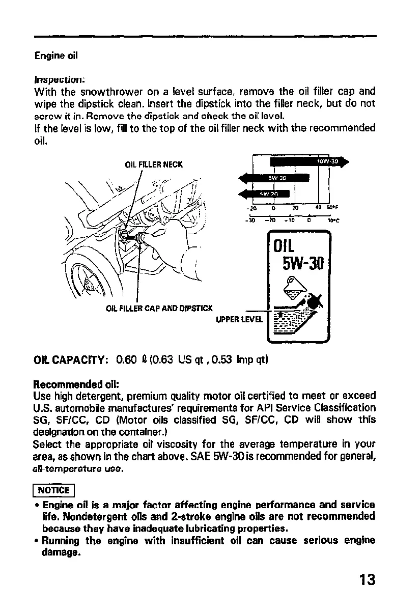 With the snowthrower on a level surface, remove the oil filler cap and