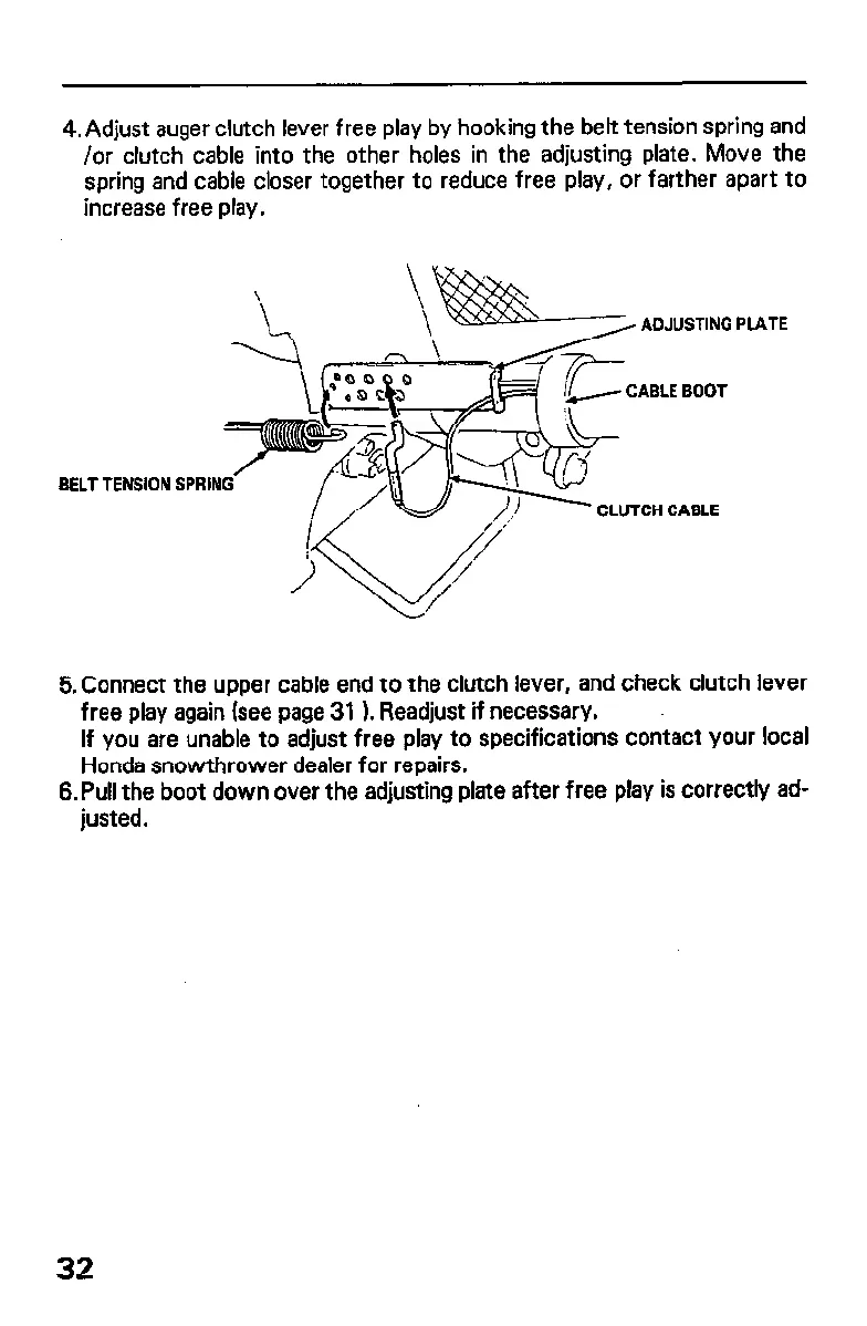 4. Adjust auger clutch lever free play by hooking the belt tension spring and