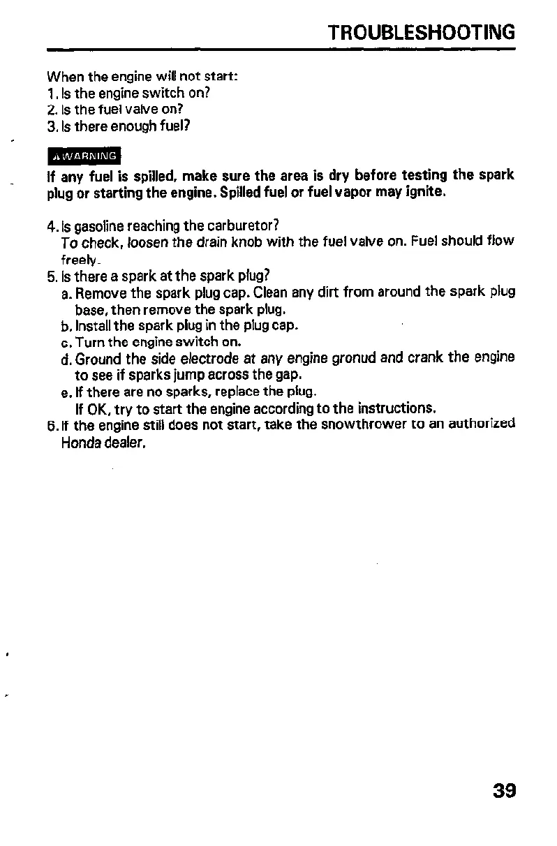 If any fuel is spilled, make sure the area is dry before testing the spark
