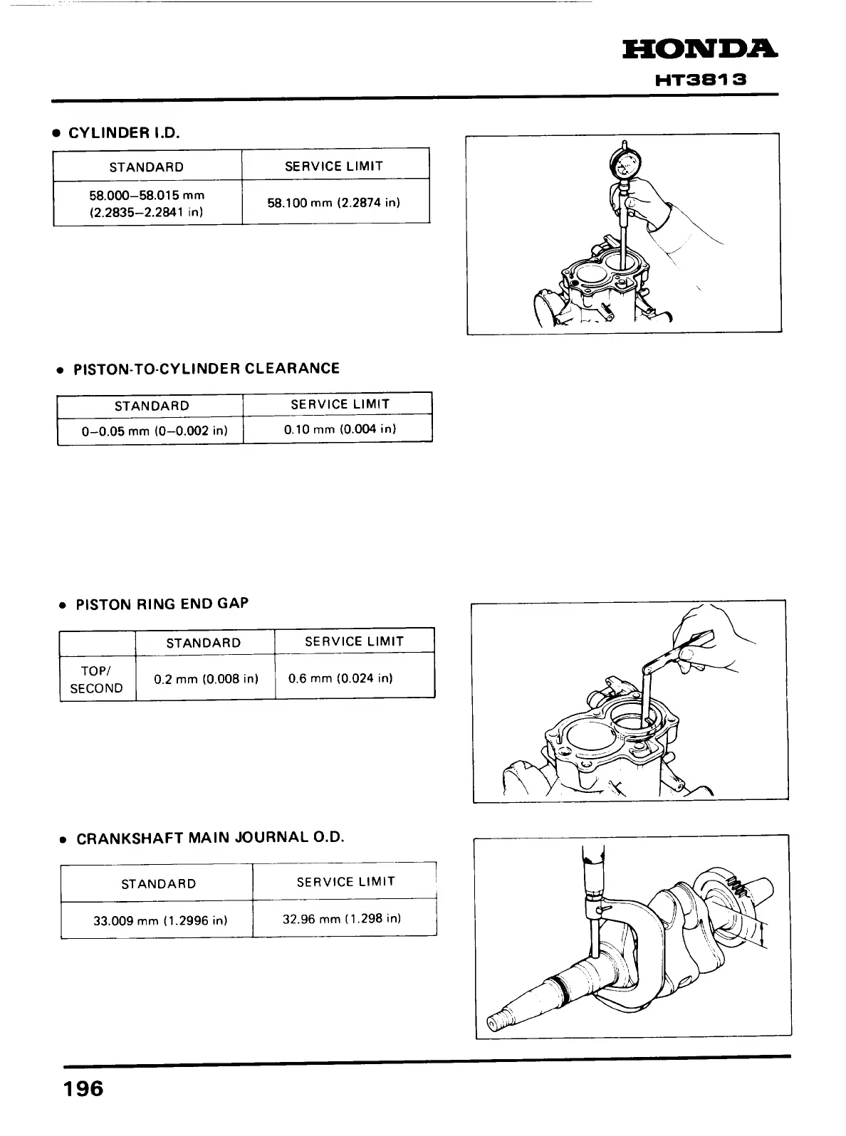 Honda HT3813 - Cylinder I.D.; Piston-To-Cylinder Clearance; Piston Ring End Gap; Crankshaft Main Journal O.D.