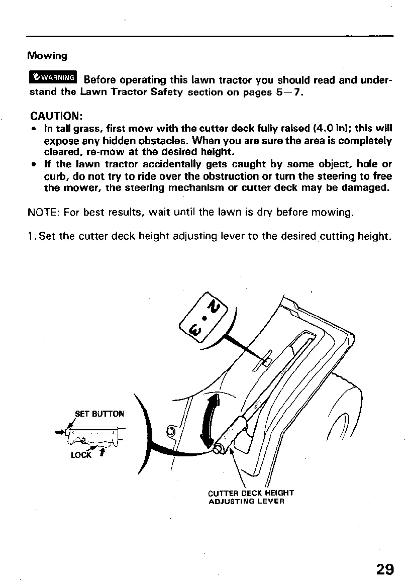 1. Set the cutter deck height adjusting lever to the desired cutting height.