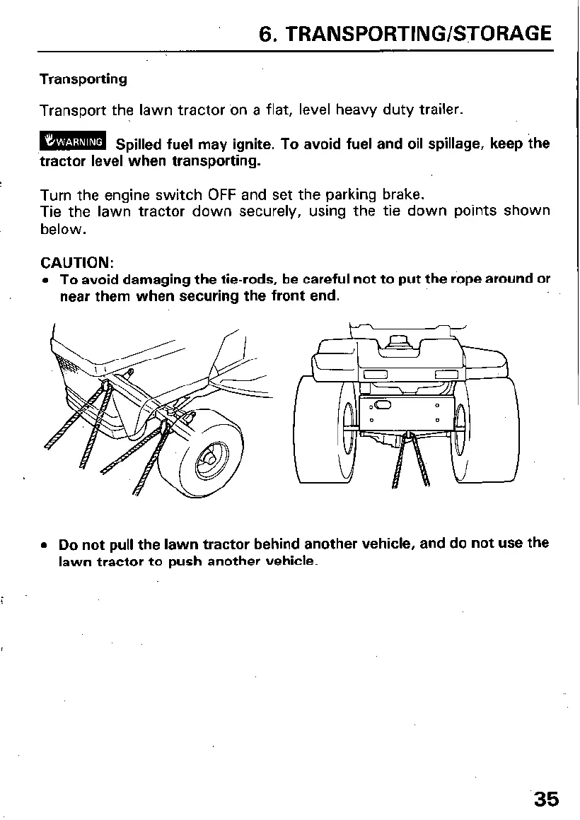 l Do not pull the lawn tractor behind another vehicle, and do not use the