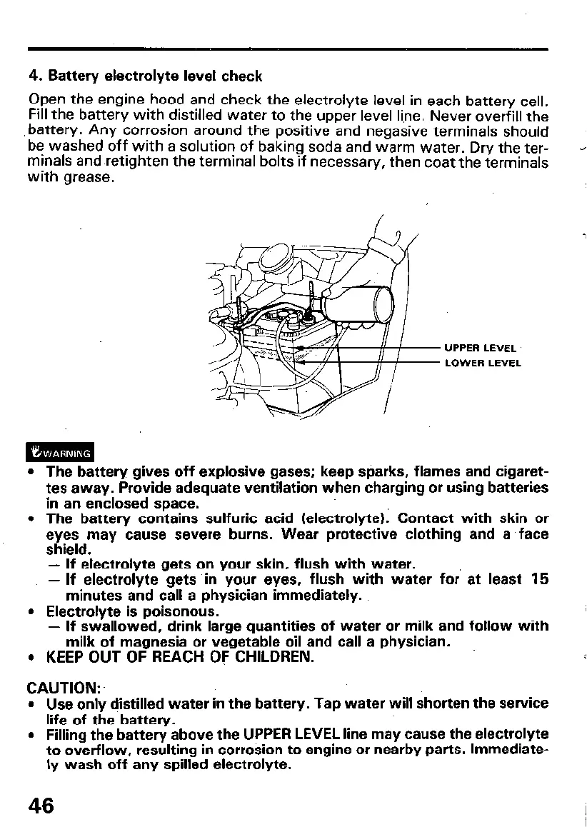 l Filling the battery above the UPPER LEVEL line may cause the electrolyte