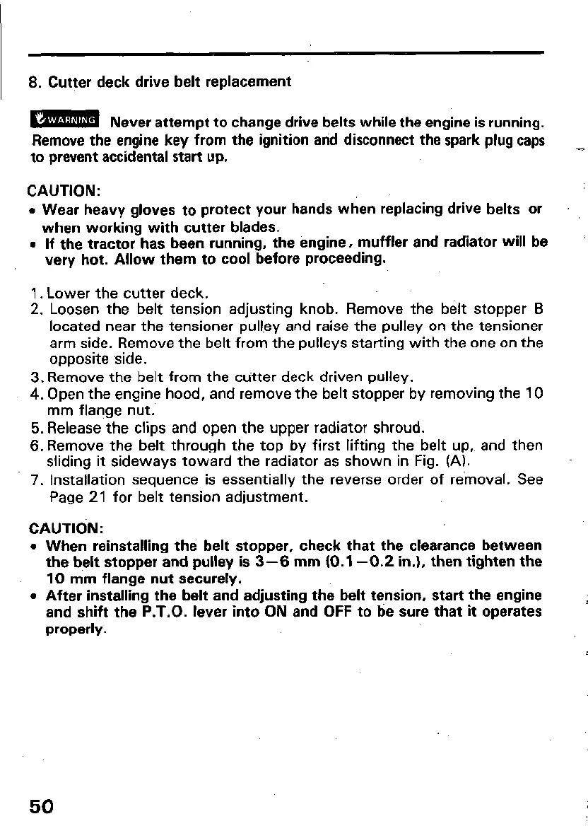 l Wear heavy gloves to protect your hands when replacing drive belts or