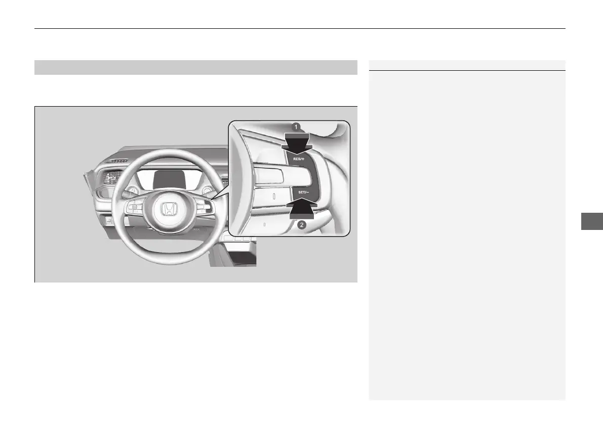 • If you press and hold the RES/+ or SET/− button, the vehicle speed increases or