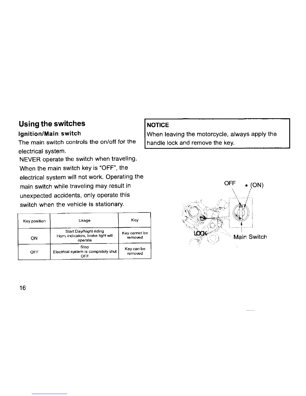 Honda MONKEY - Using the Switches; Ignition;Main Switch Operation