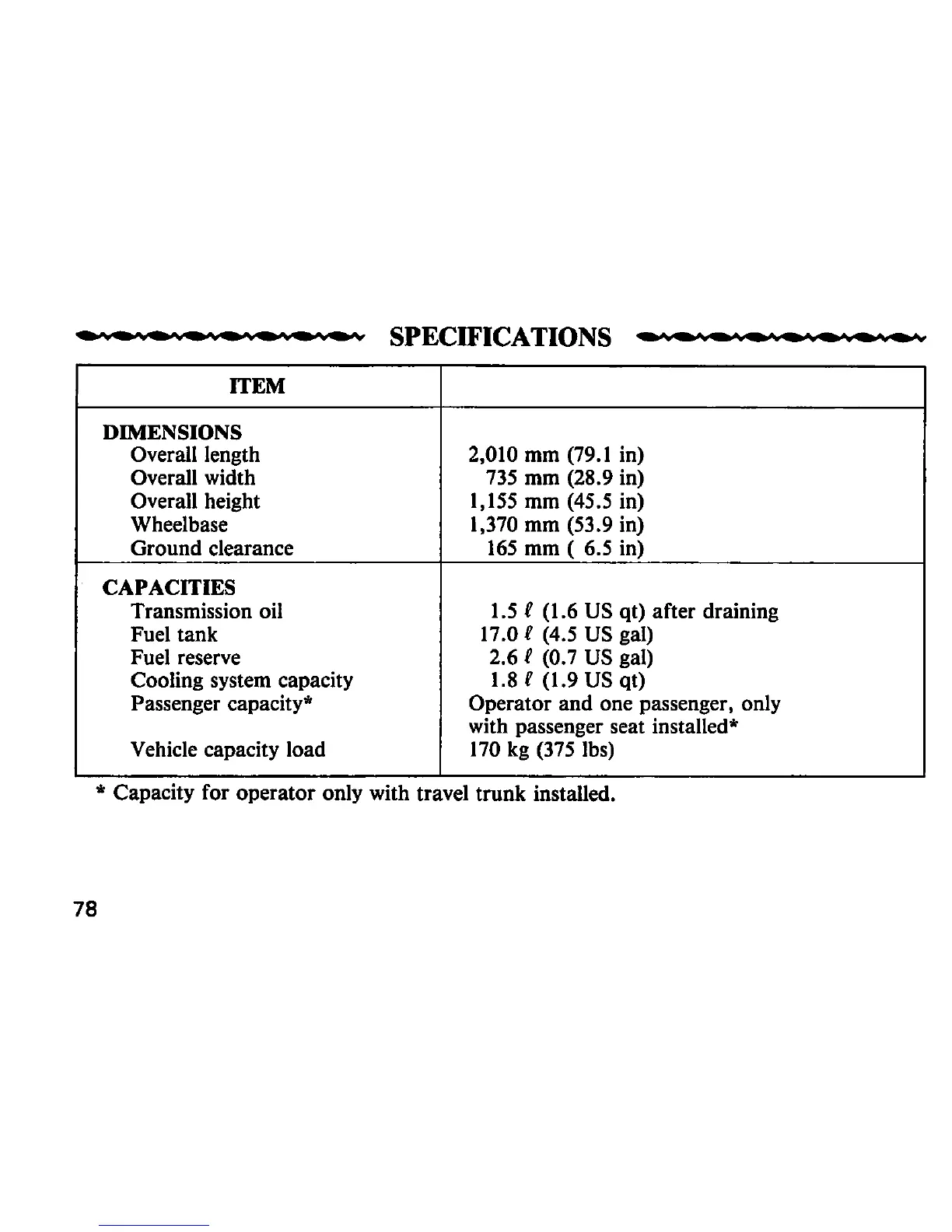 Honda MVX250F - Specifications; Dimensions; Capacities