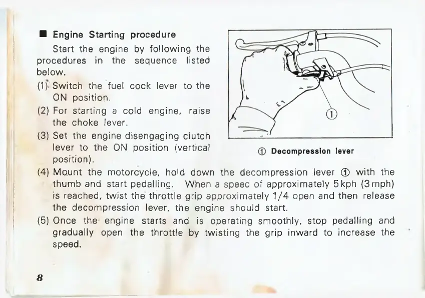 (5) Once the engine starts and is operating smoothly, stop pedalling and