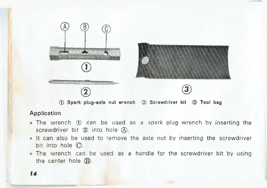 © Spark plug-axle nut wrench (§) Screwdriver bit (§) Tool bag