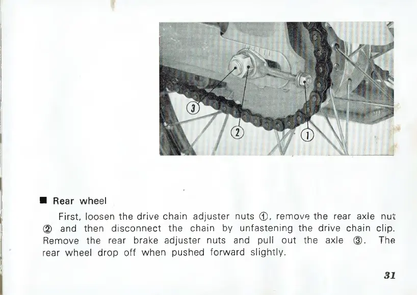 Remove the rear brake adjuster nuts and pull out the axle (3). The