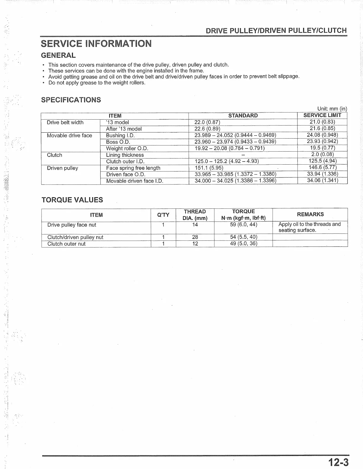 • This section covers maintenance of the drive pulley, driven pulley and clutch.