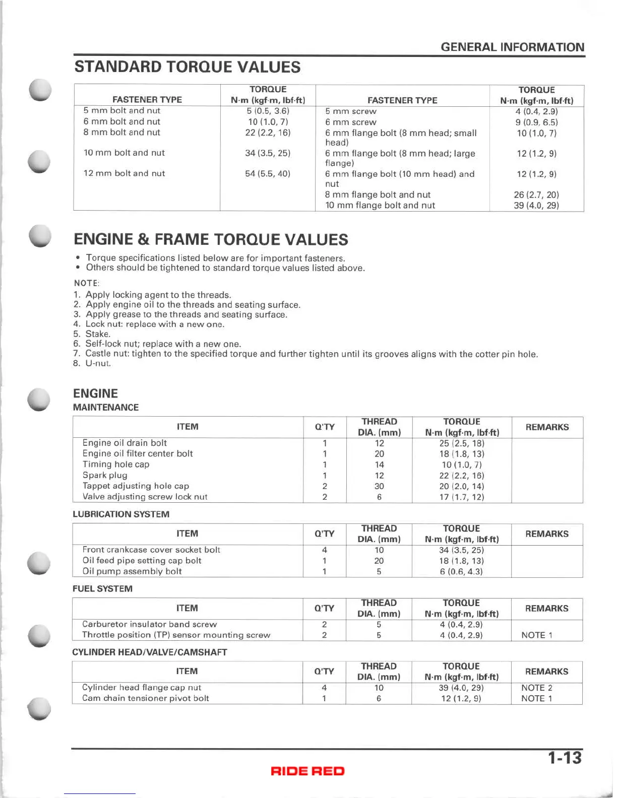 Honda TRX400FA - Standard Torque Values; Engine & Frame Torque Values