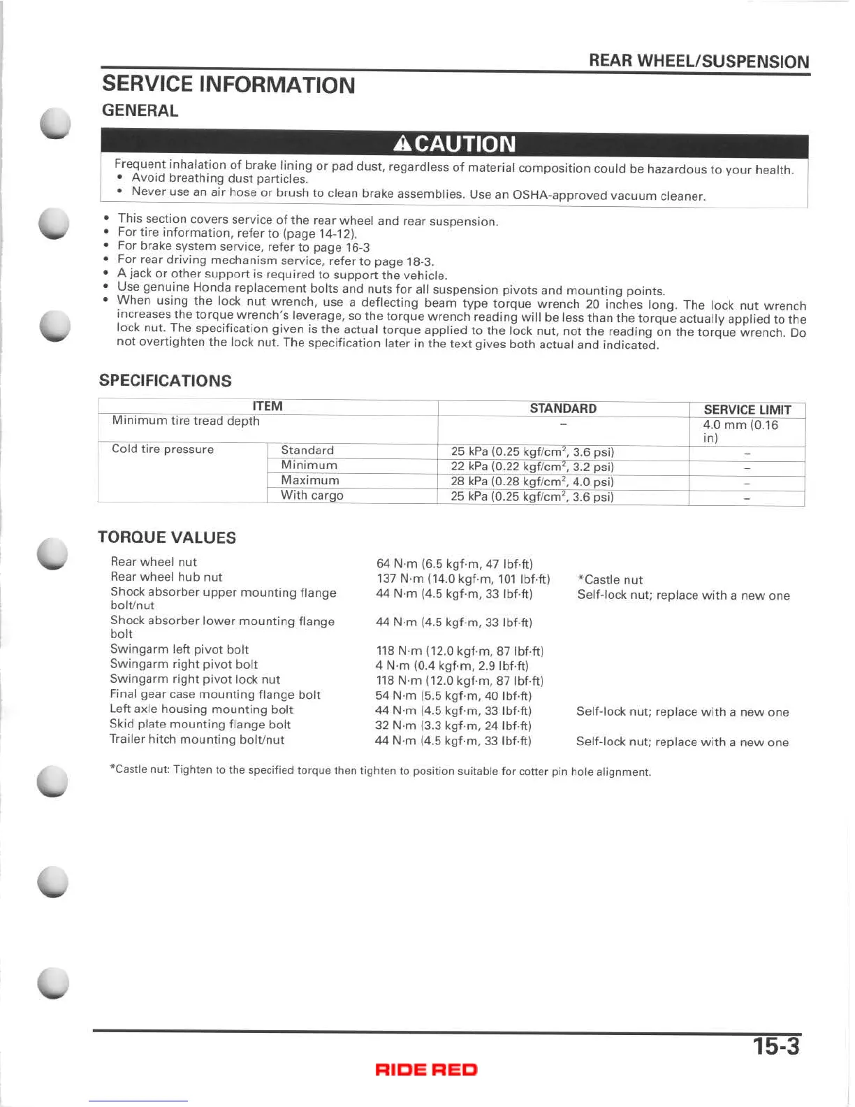 Honda TRX400FA - Rear Wheel;Suspension Service Information