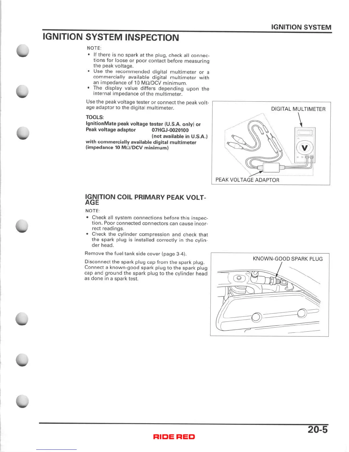 Honda TRX400FA - Ignition System Inspection; Ignition Coil Primary Peak Voltage