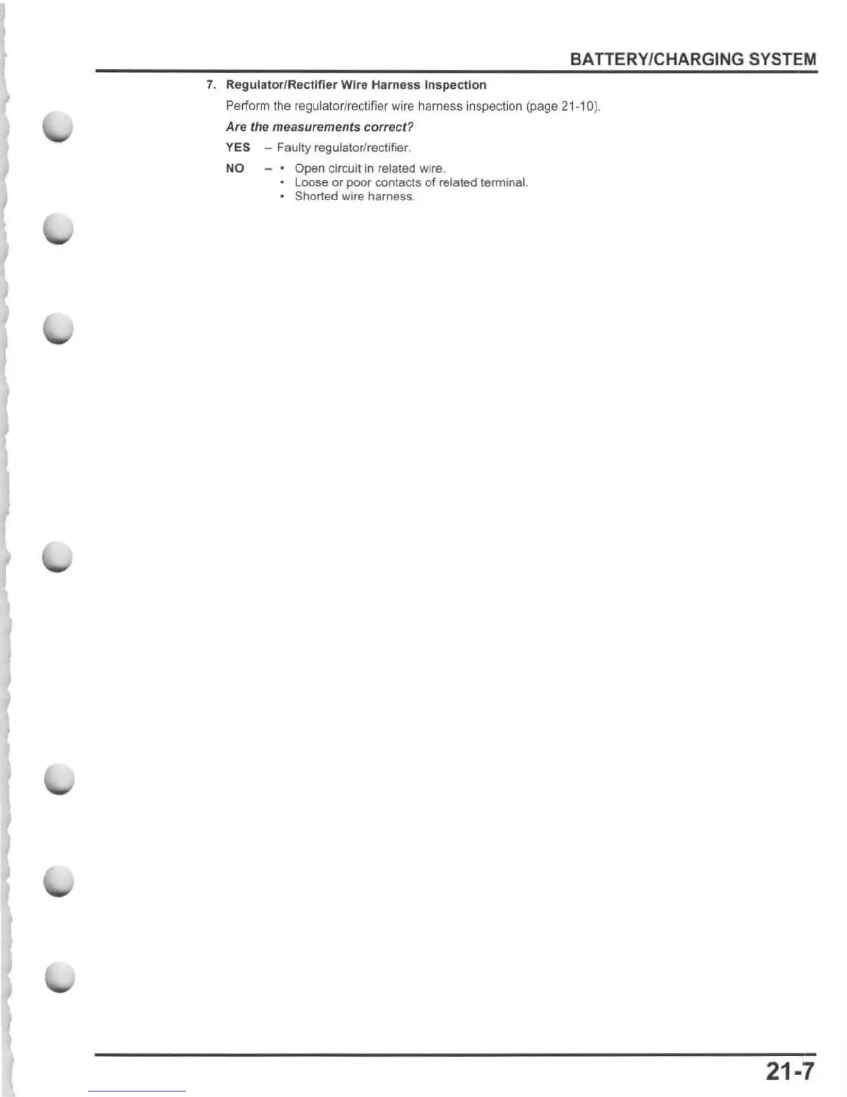 Perform the regulator/rectifier wire harness inspection (page 21-10).