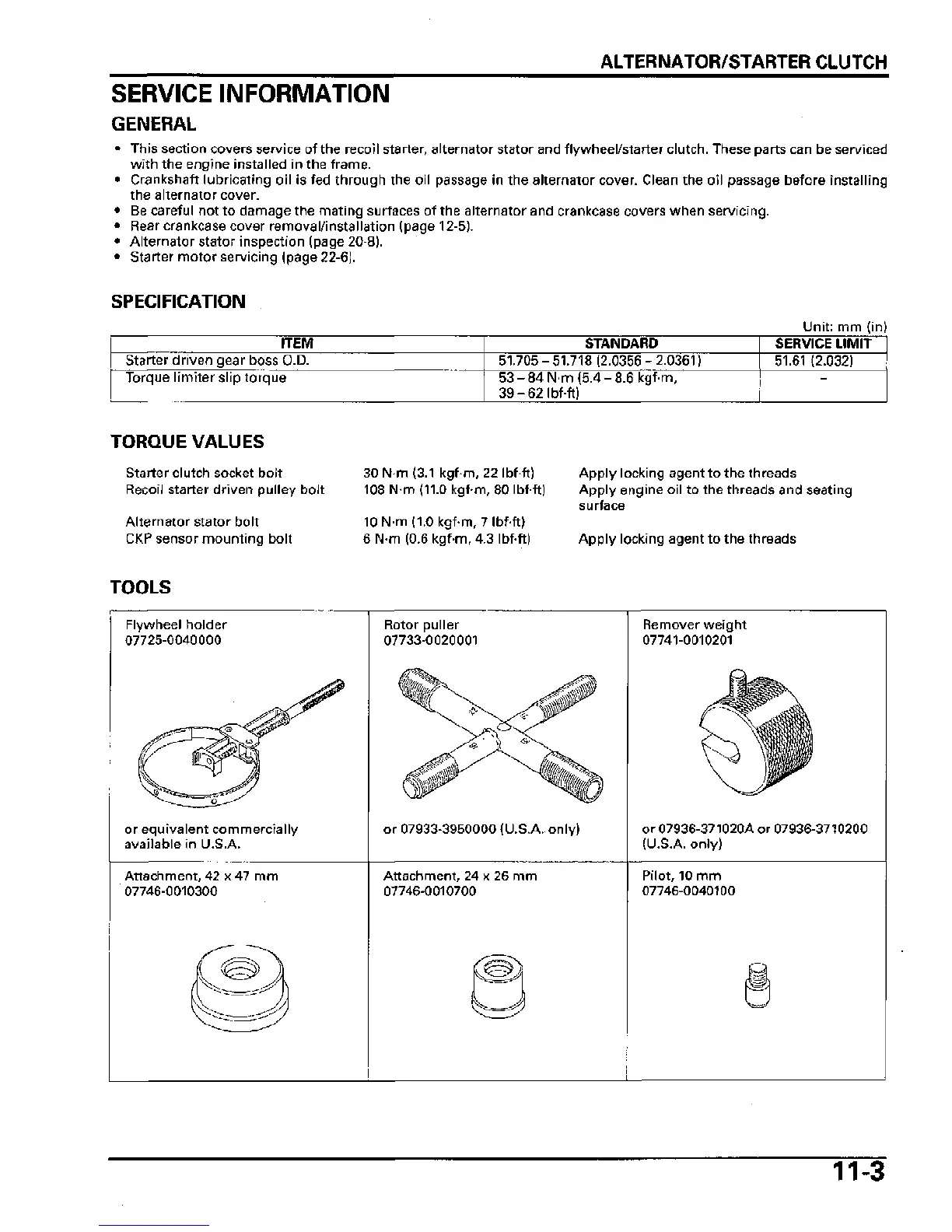 • This section covers service of the recoil starter, alternator stator and flywheel/starter clutch. These parts can be serviced