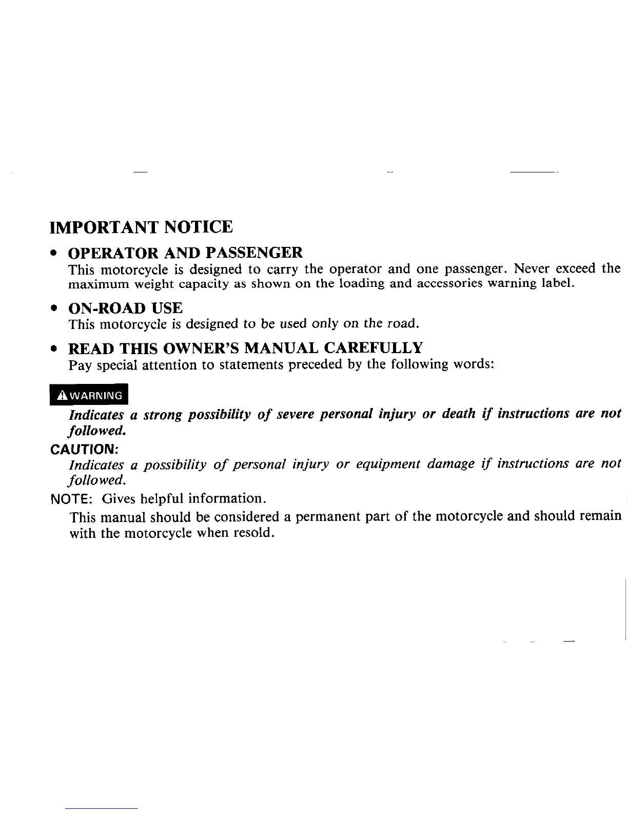 Honda VT250F - IMPORTANT NOTICE; OPERATOR AND PASSENGER; ON-ROAD USE; READ THIS OWNERS MANUAL CAREFULLY