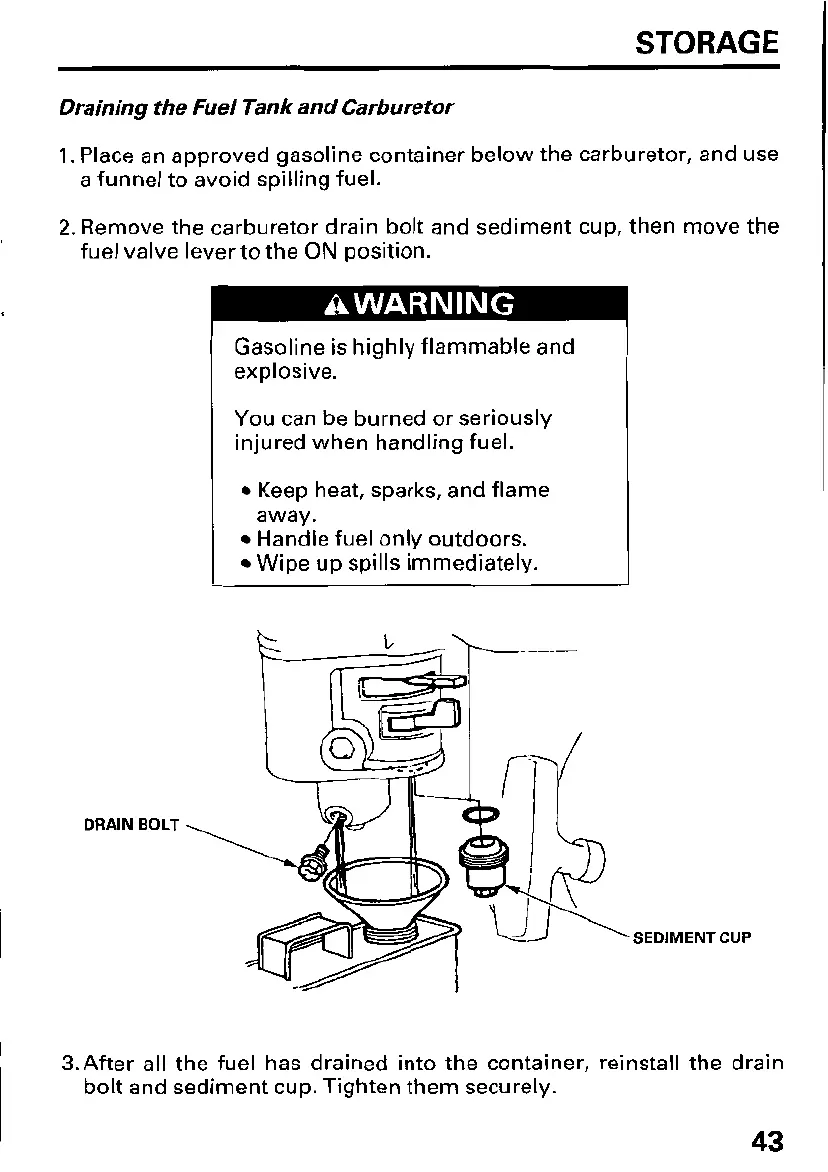 Remove the carburetor drain bolt and sediment cup, then move the