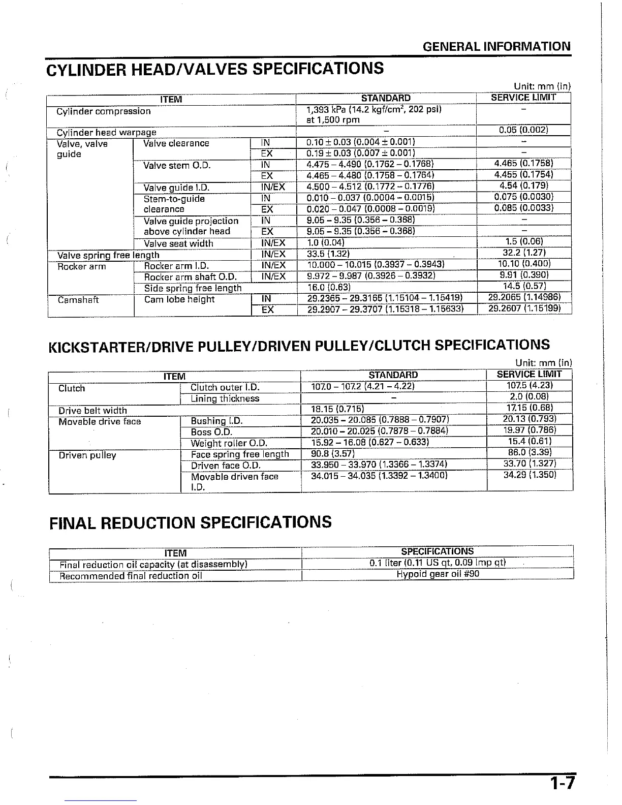 Honda Zoomer - Cylinder Head;Valves Specifications; Kickstarter;Drive Pulley;Drive Pulley;Clutch Specifications; Final Reduction Specifications