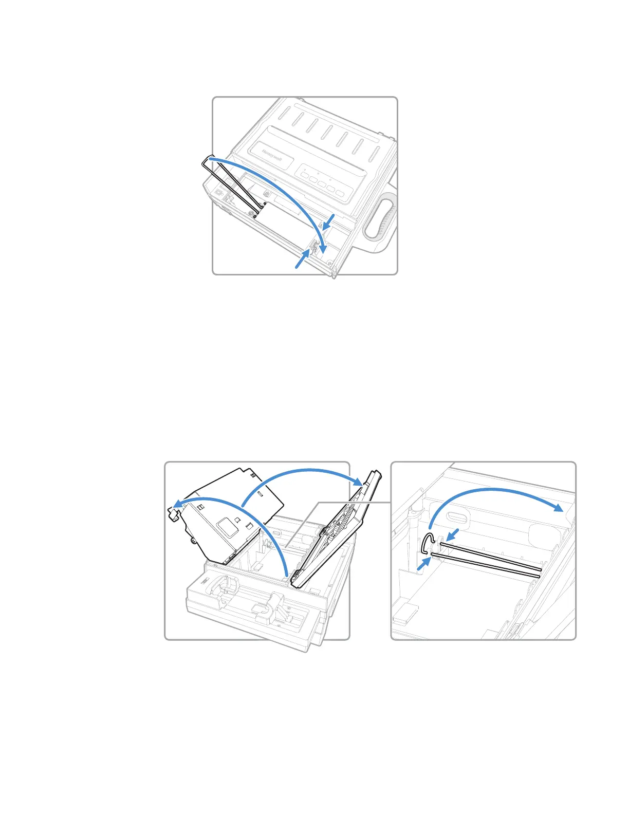 1 Open the printer lid and lift the tabs to tile the printer mechanism up and out