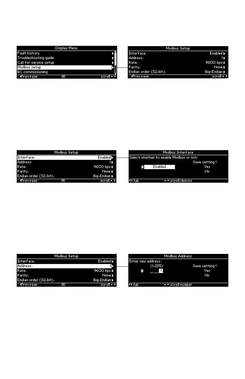 The Modbus slave address can be edited by selecting the “Address” line and pressing the