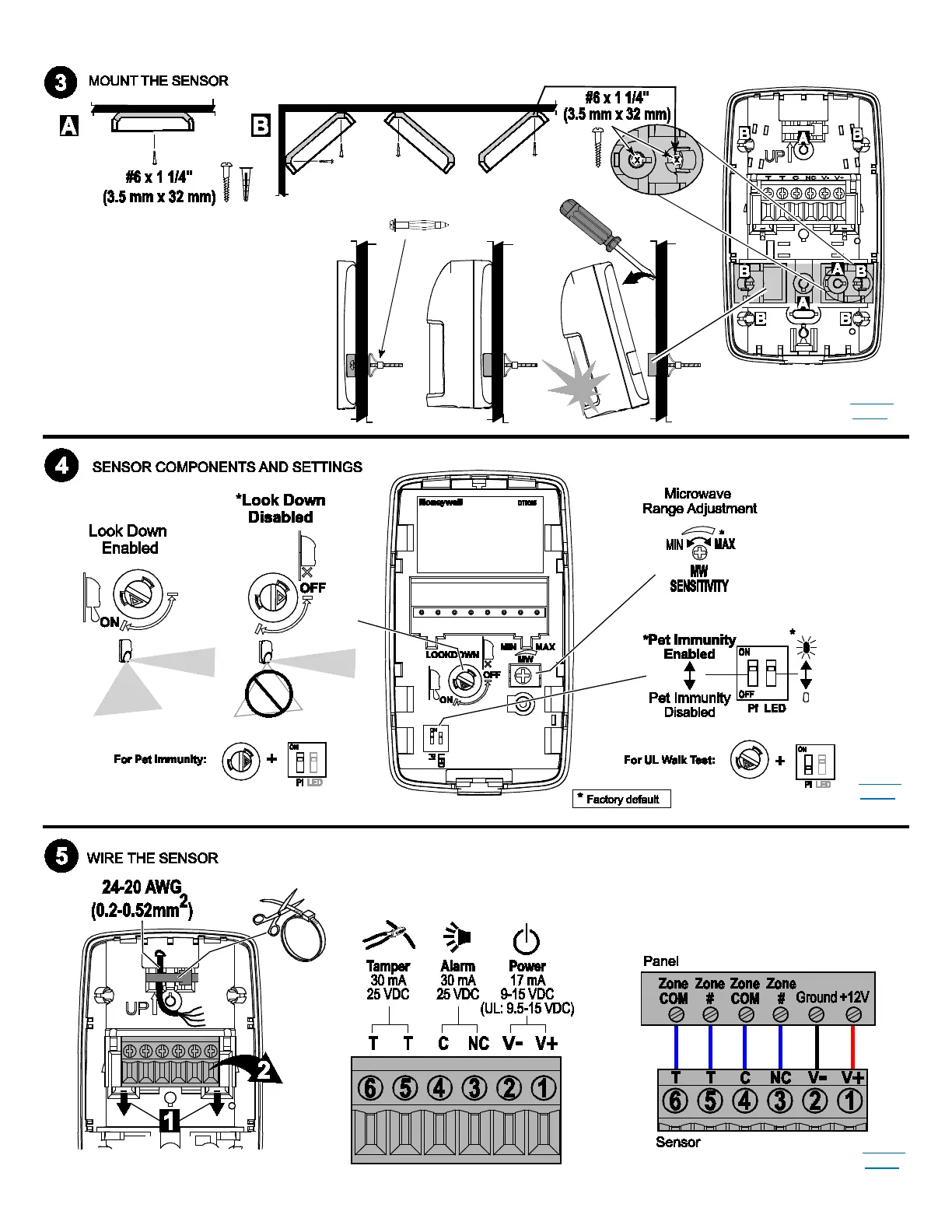 Honeywell DT8035 Dual Tec - Mount the Sensor; Sensor Components and Settings; Wire the Sensor