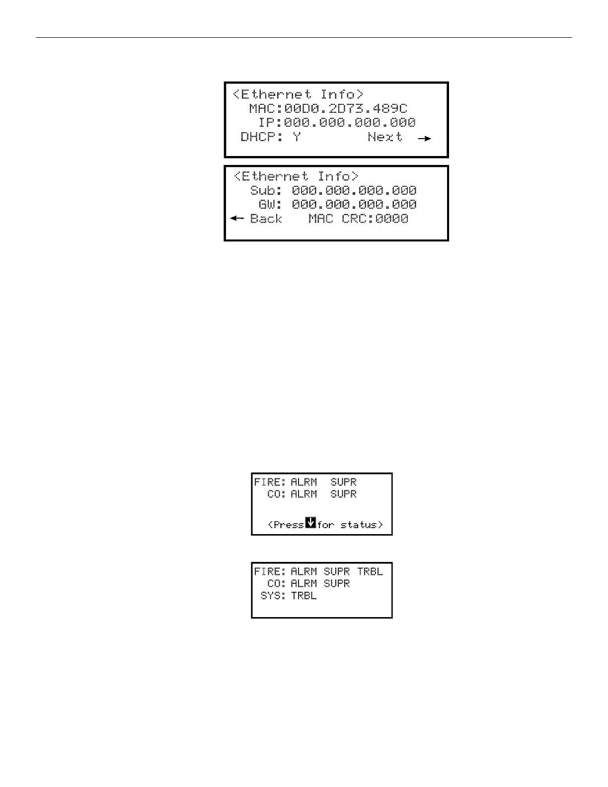 The 3 and 4th line will show the status of which event types are active for each system (fire and CO). The Auto Display Event