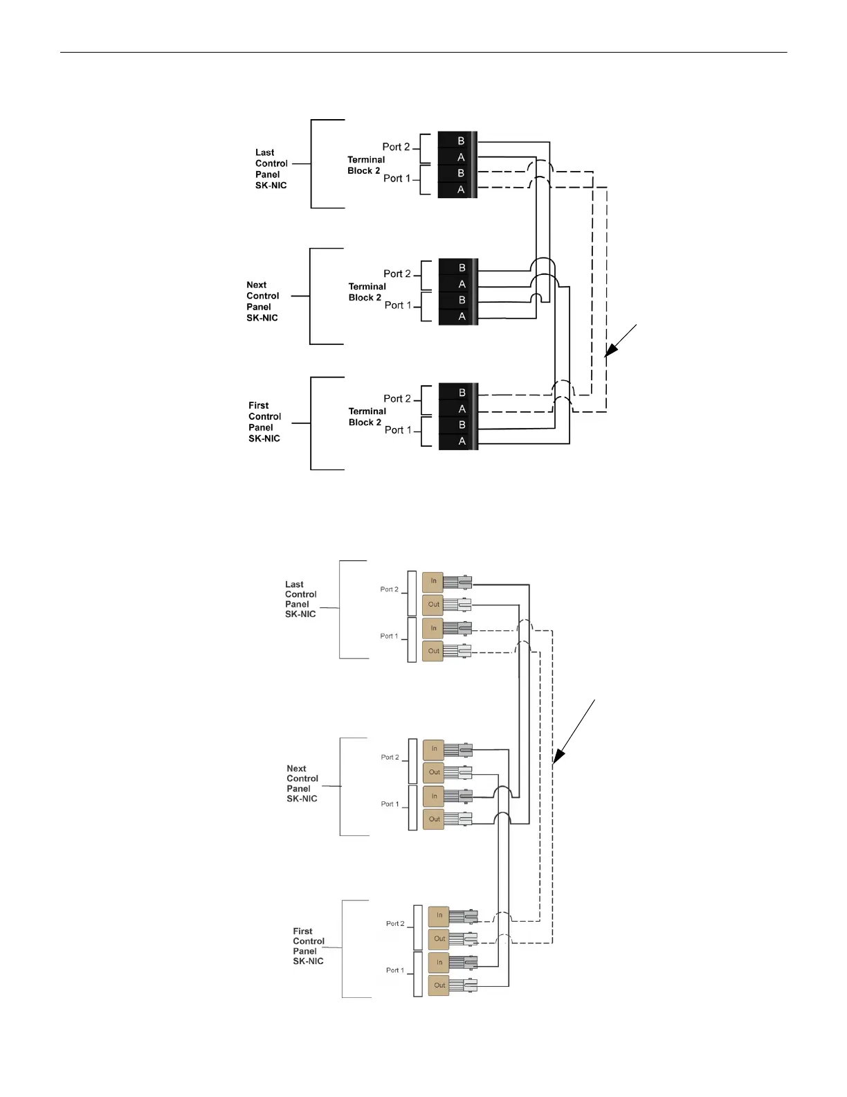 Unshielded twisted pair wiring between multiple panels is shown in Figure 5.7. Class A wiring is shown with a dotted line.