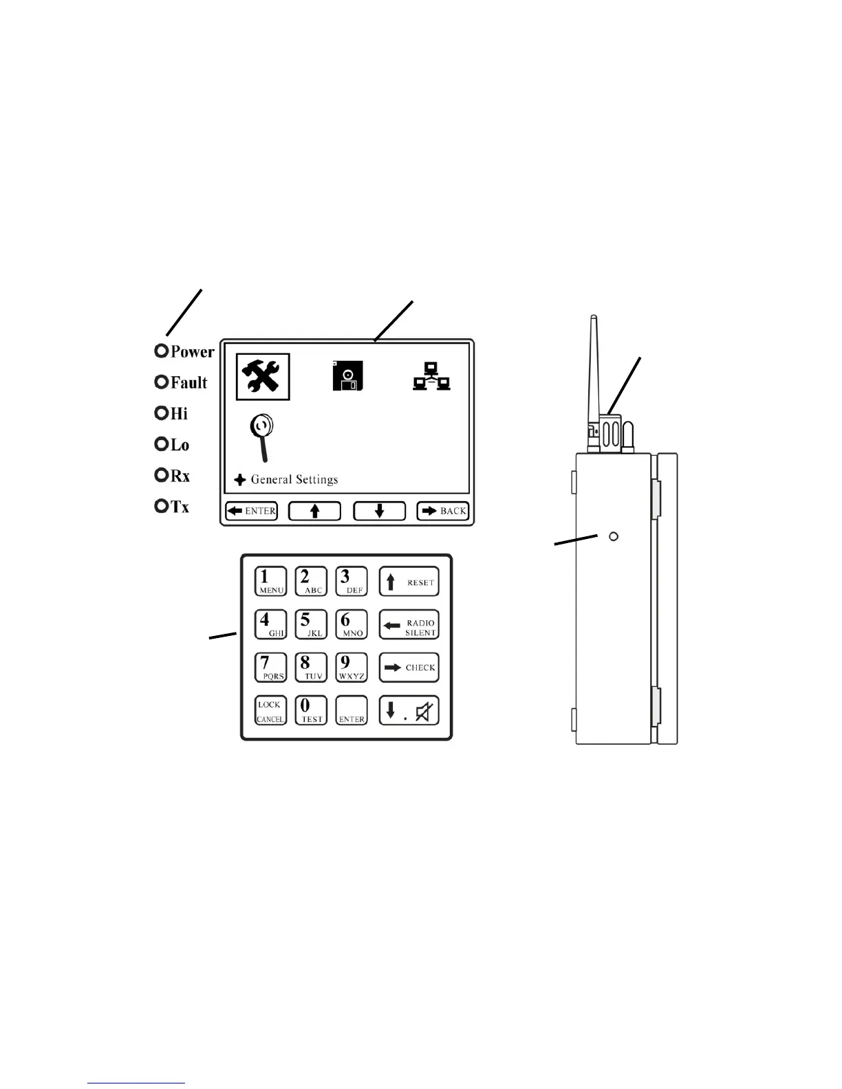LEDs, an alarm buzzer, an alarm light, and 16 keys.