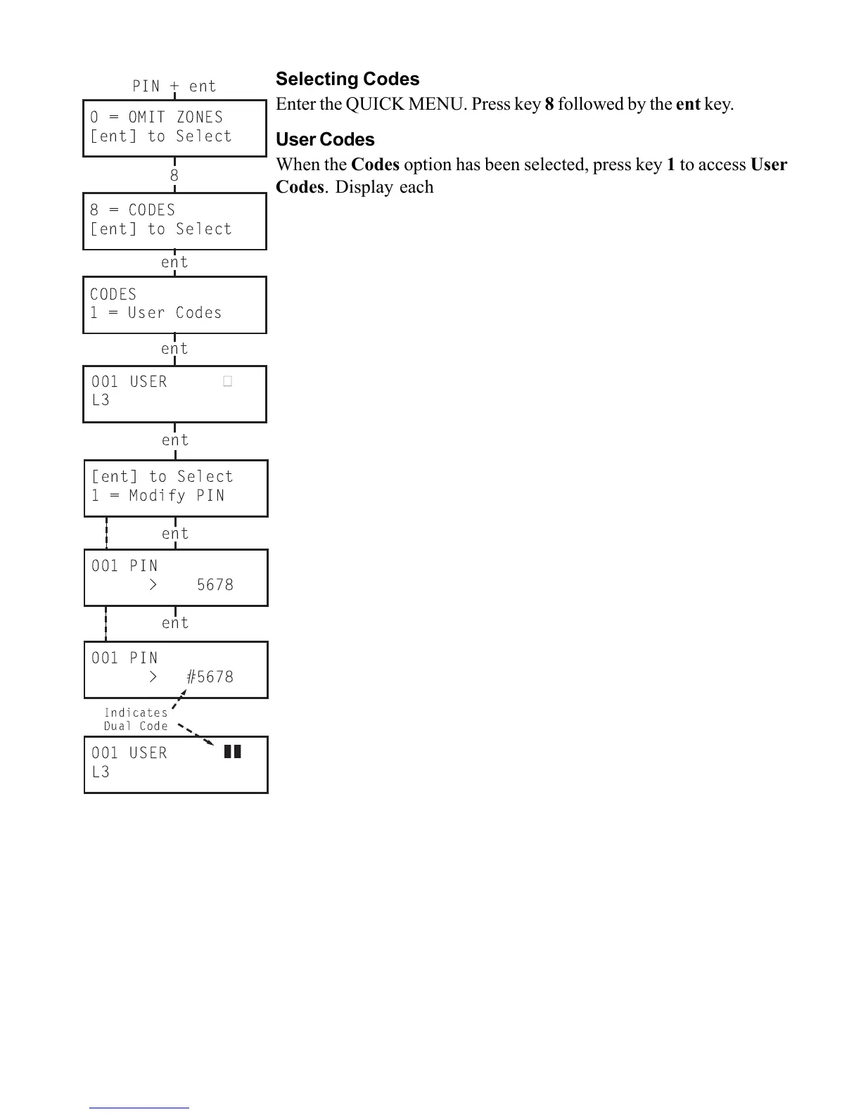 When the Codes option has been selected, press key 1 to access User