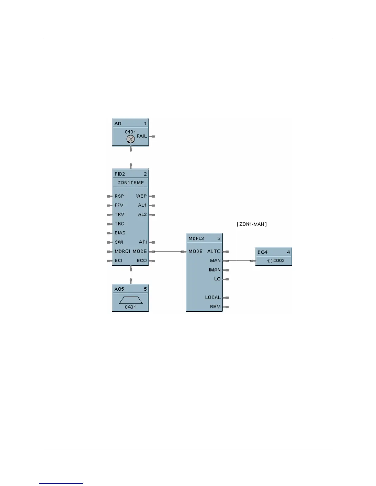 HFigure 54 shows a Function Block Diagram using an MDFL function block. The mode output of the PID