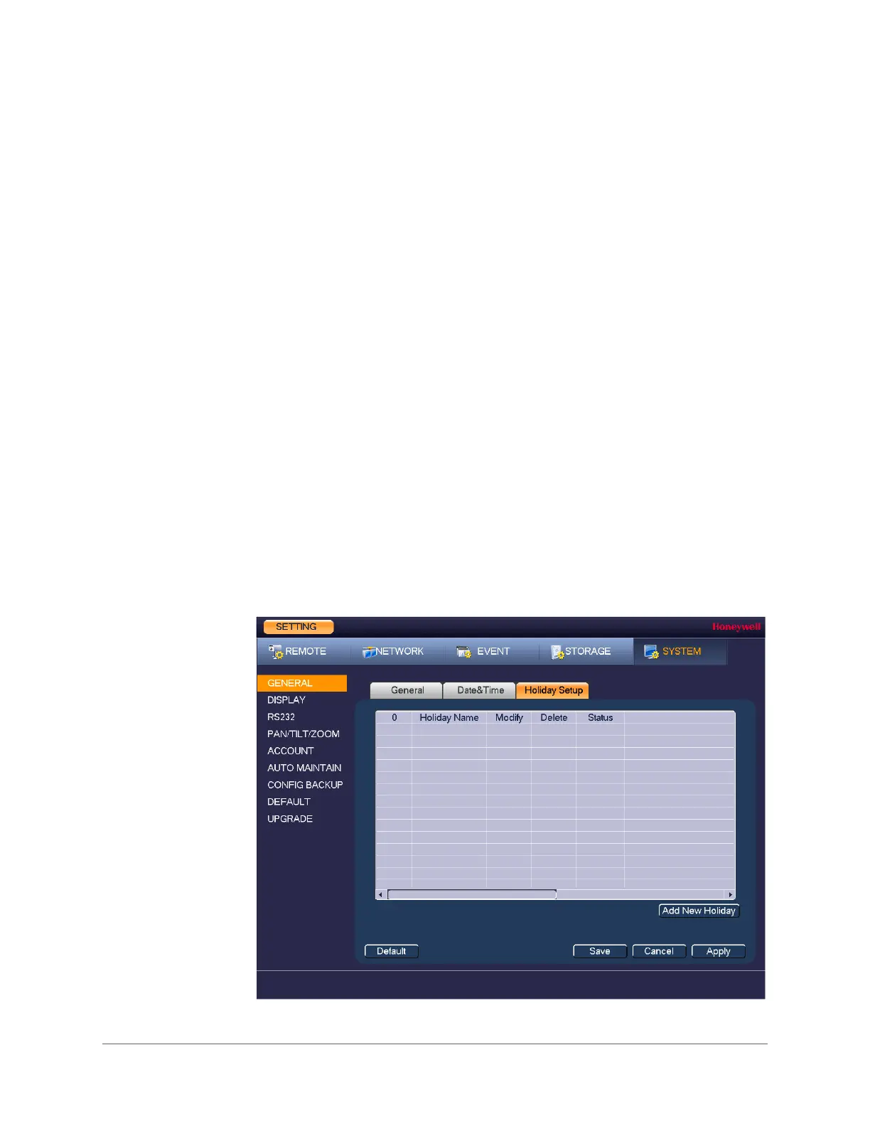 1. Go to Main Menu > SETTING > SYSTEM > GENERAL > Holiday Setup.
