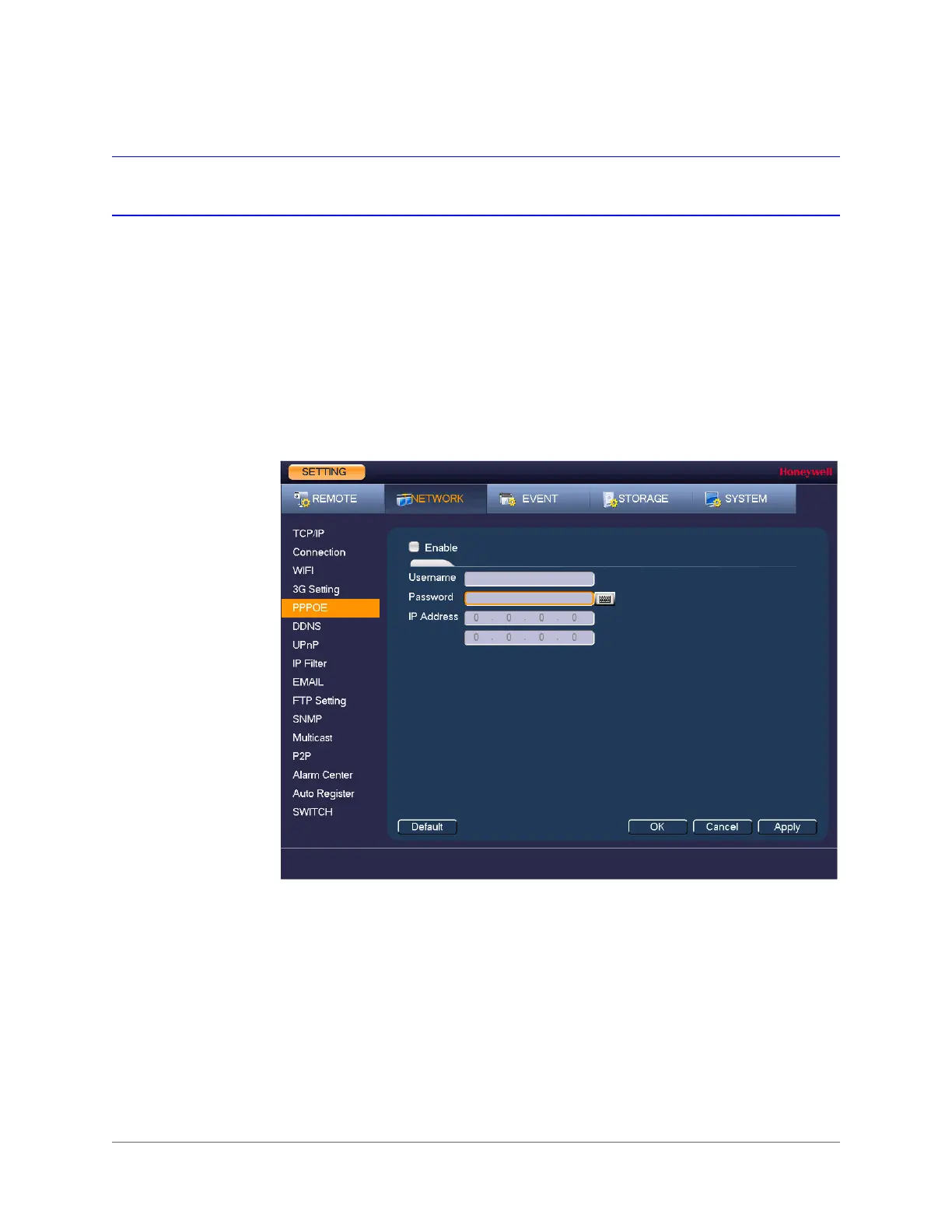 1. In the SETTING field in the Main Menu, go to NETWORK > PPPOE.