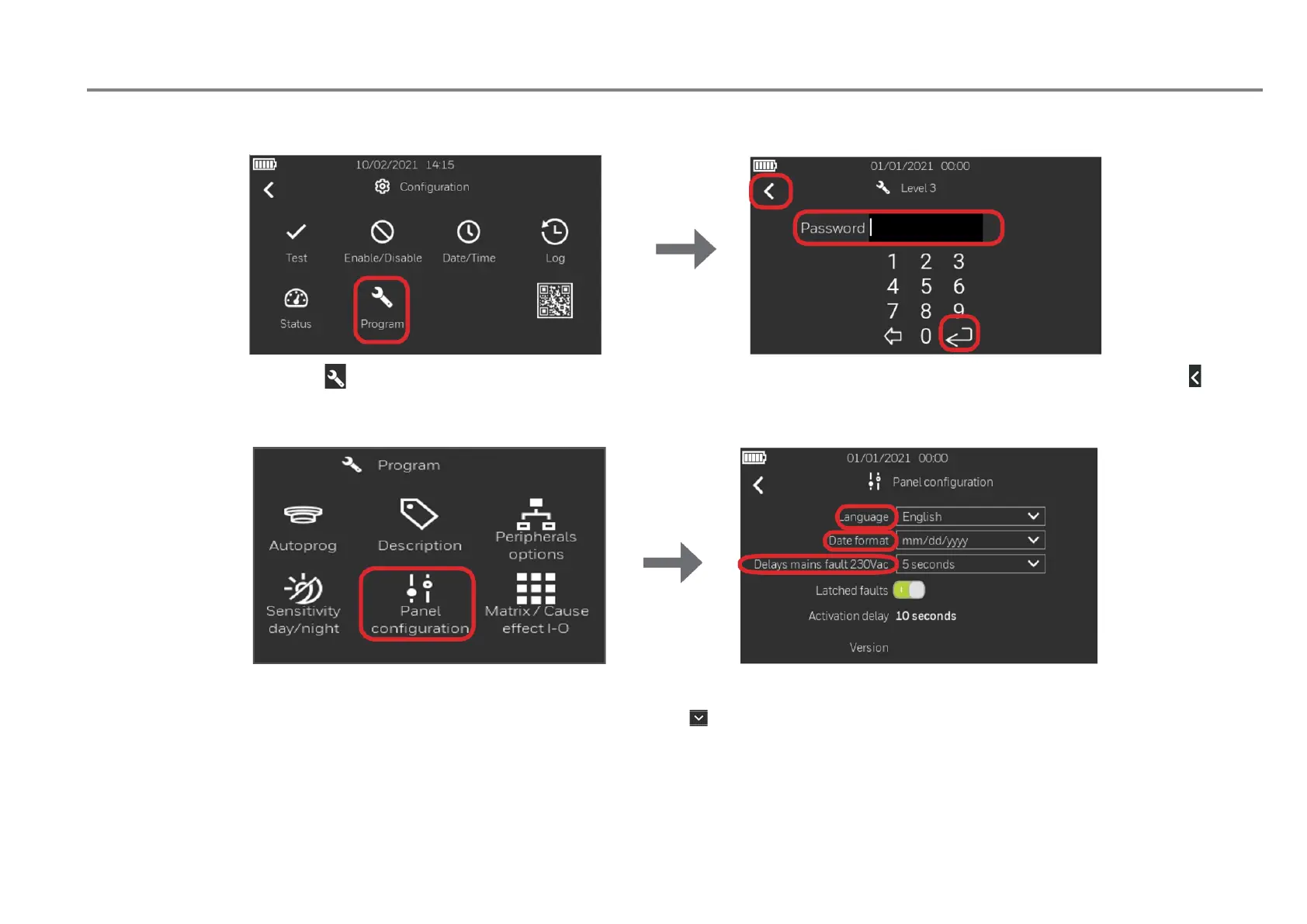 1. Press on the “Program” icon and insert the password of level 3 (33333333). Press the "enter" key to confirm the password. Press on the back arrow to go
