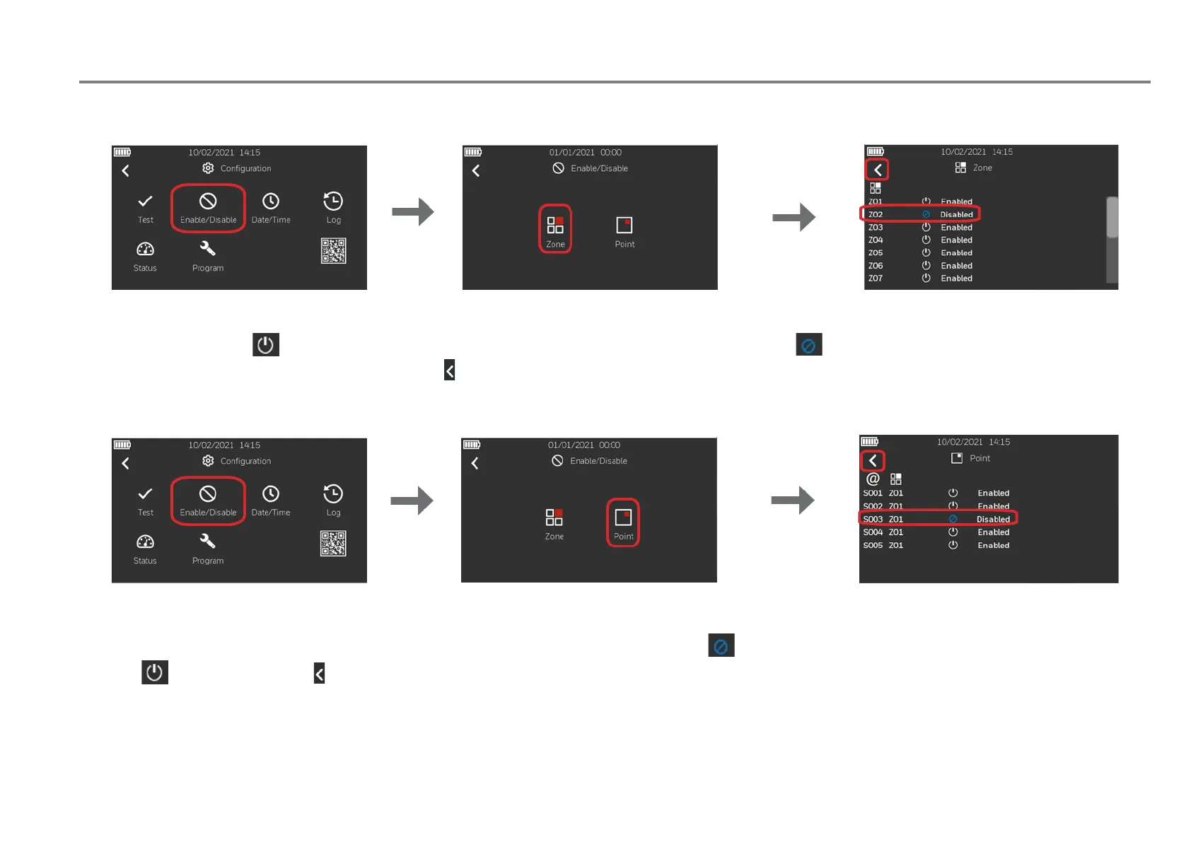 1. Follow the steps to enter in "Configuration" menu, select “Enable/Disable” icon to have access to Zone and Point options, then select Zone to view the list and