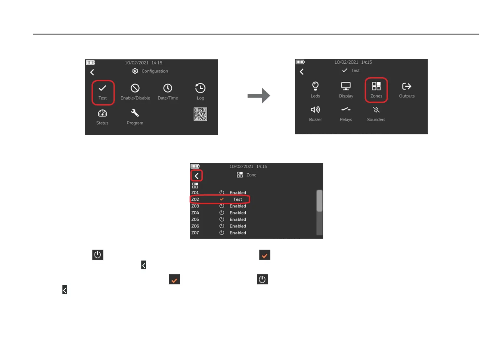 1. Follow the steps to enter in “Configuration” menu, select “Test" to access to the related options, then select “Zones” icon to view the Zone list.