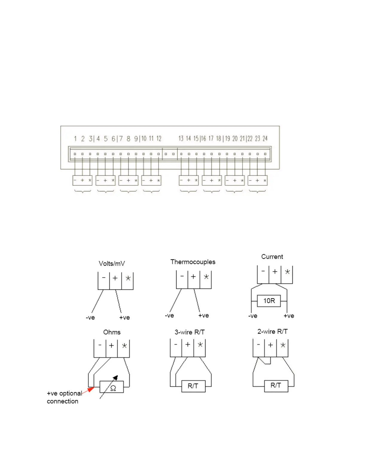 The connections for each channel are the same; the diagrams below show the correct connections for each input type;