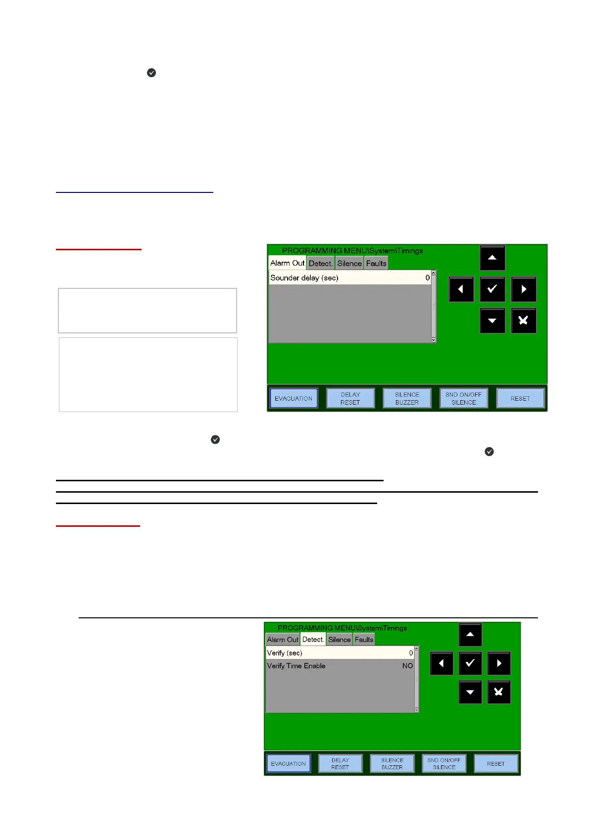 In this sub-menu are programmed some delay times of the alarm outputs, the delay time for the sensor alarm
