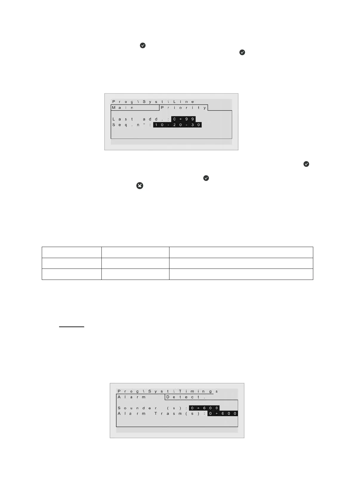 This sub menù allows the programming of the delay time for the alarm outputs, the delay time for the check