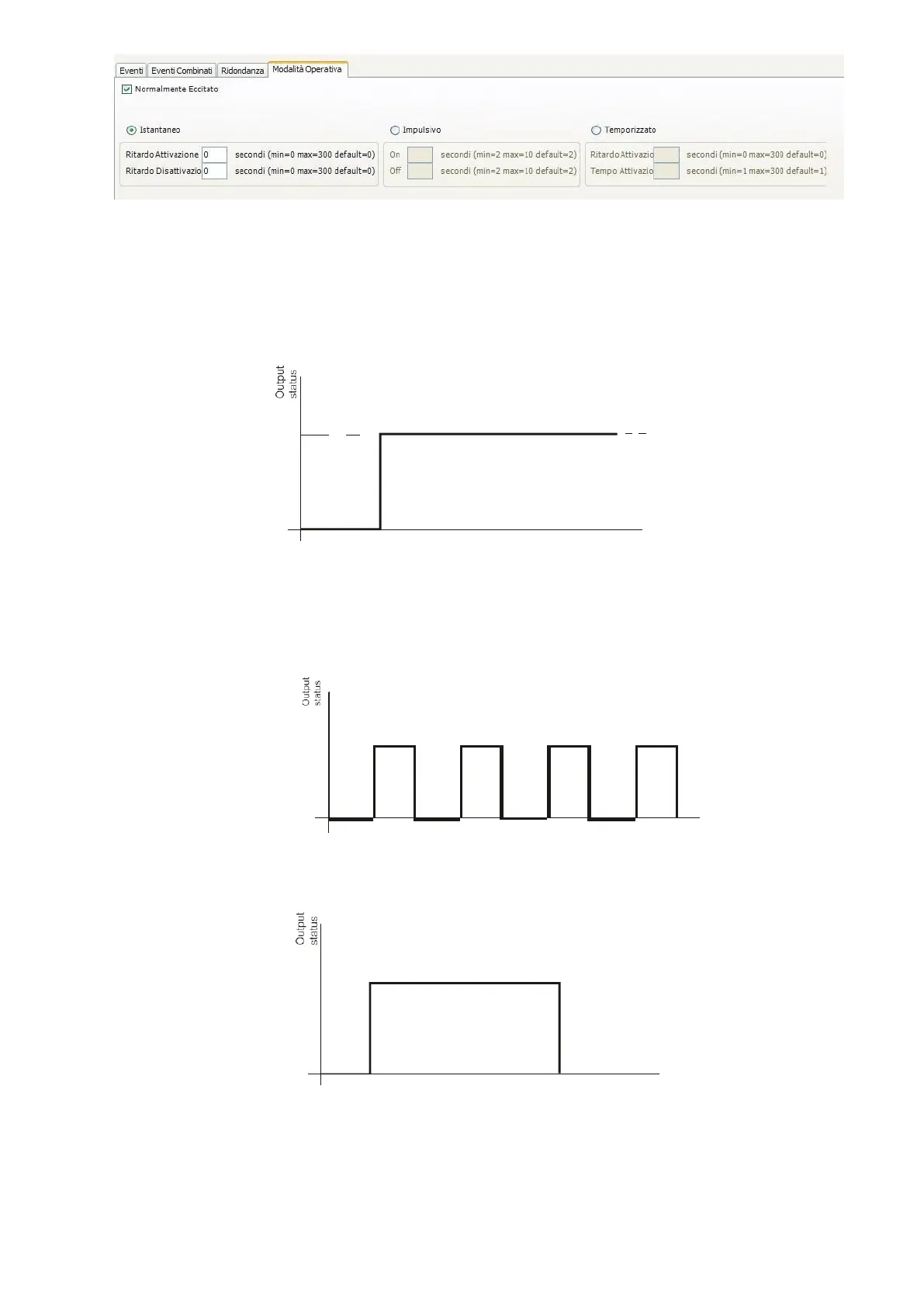 Instantaneous follows the status of the event: Event active: (detector in alarm) output
