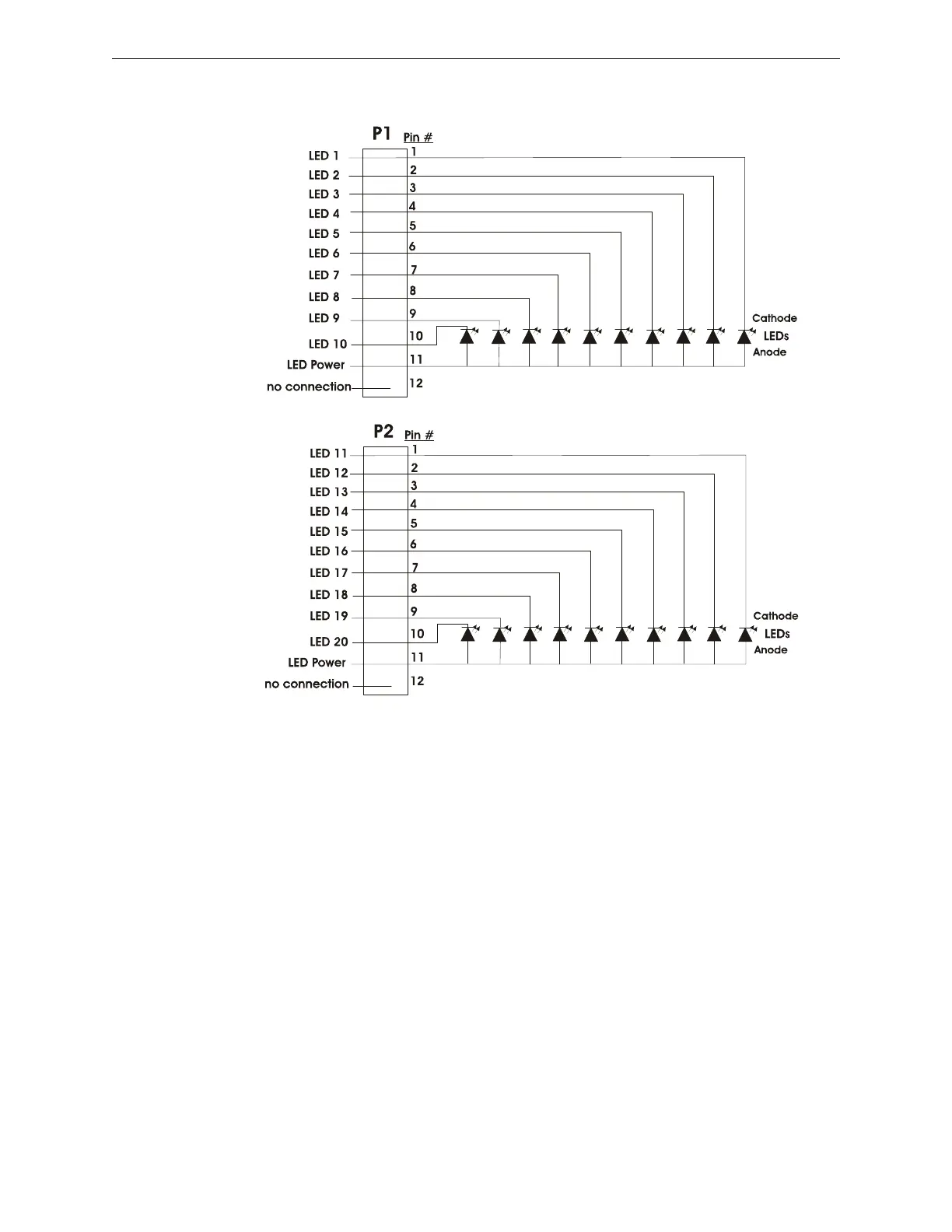 P1 and P2. Wiring is identical for P3 (LEDs 21-30) and P4 (LEDs 31-40).